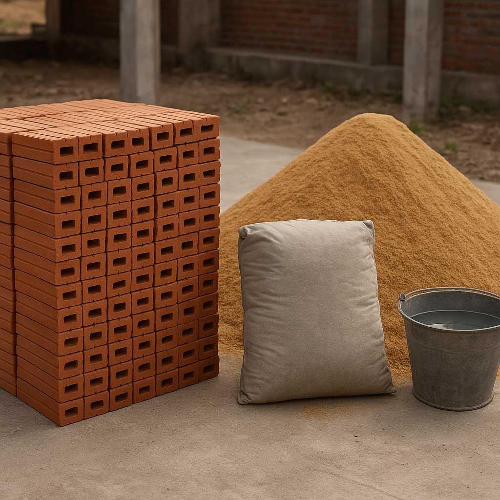 Vật Liệu Chính | – Gạch xây: Chọn gạch chất lượng, kích thước đồng đều, bề mặt có vân để tăng độ bám dính. Phổ biến là gạch tuynel 4 lỗ hoặc gạch đặc. – Cát xây: Cát sạch, đã sàng lọc, không lẫn tạp chất, bùn đất. – Xi măng: Chọn loại xi măng uy tín, còn hạn sử dụng, được bảo quản nơi khô ráo. – Thép râu (F6 hoặc F8): Dùng để cấy vào cột bê tông, liên kết tường với khung kết cấu, tăng độ vững chắc. |