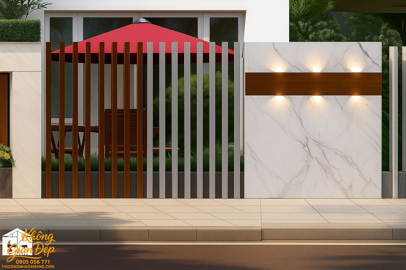 Hệ thống tường rào cũng là một điểm nhấn đắt giá, kết hợp giữa lam sắt hiện đại, tường ốp đá marble vân mây sang trọng và đèn hắt sáng tinh tế, tạo nên một tổng thể vừa an toàn, vừa thẩm mỹ.
