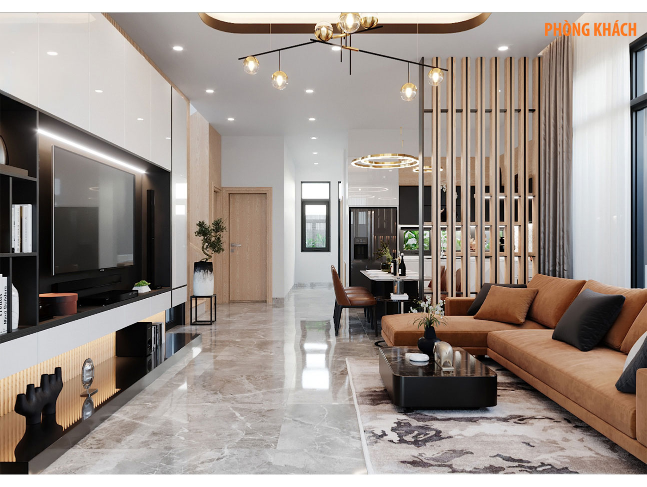 Phòng khách được thiết kế mở rộng, sử dụng nội thất cao cấp với gam màu trung tính chủ đạo. Vách tivi ốp đá tự nhiên kết hợp kệ gỗ tạo điểm nhấn sang trọng cho khu vực đón tiếp khách.