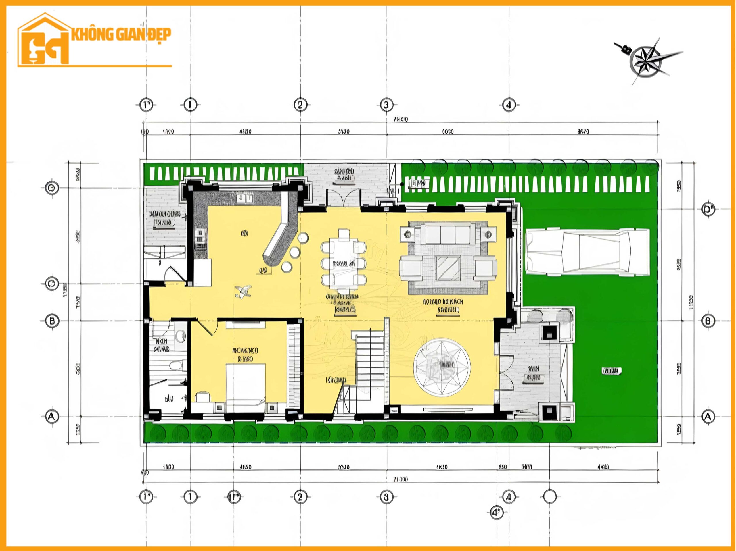 Tầng 1 (Mặt bằng trệt): Đây là không gian sinh hoạt chung và không gian phụ trợ, bao gồm:
