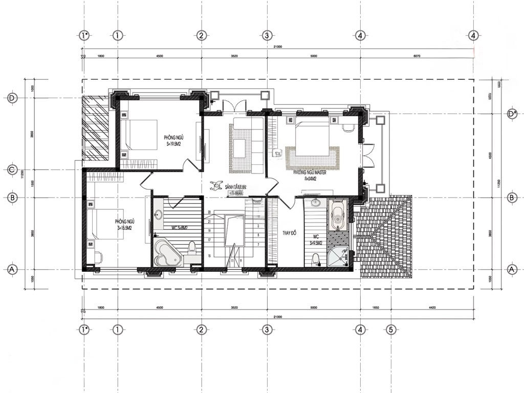 • Sảnh cầu thang: Khu vực trung tâm của tầng, kết nối các phòng.