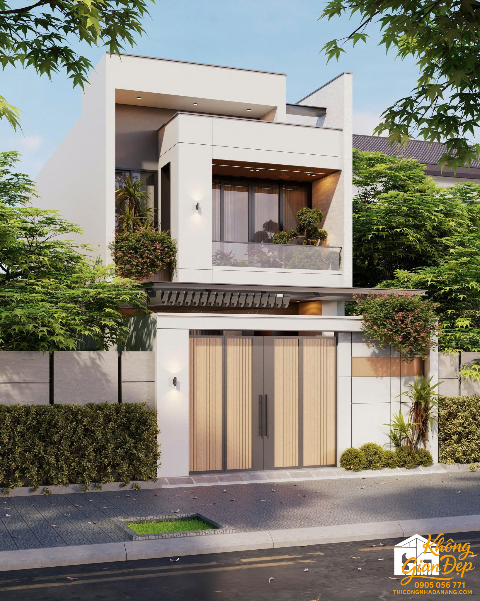 Phương án thứ 2 ra đời và ngay lập tức chinh phục được gia chủ. Sử dụng tông màu trắng chủ đạo kết hợp gỗ nhựa ngoài trời, mẫu thiết kế nhà phố 2 tầng này toát lên vẻ đẹp vượt thời gian.