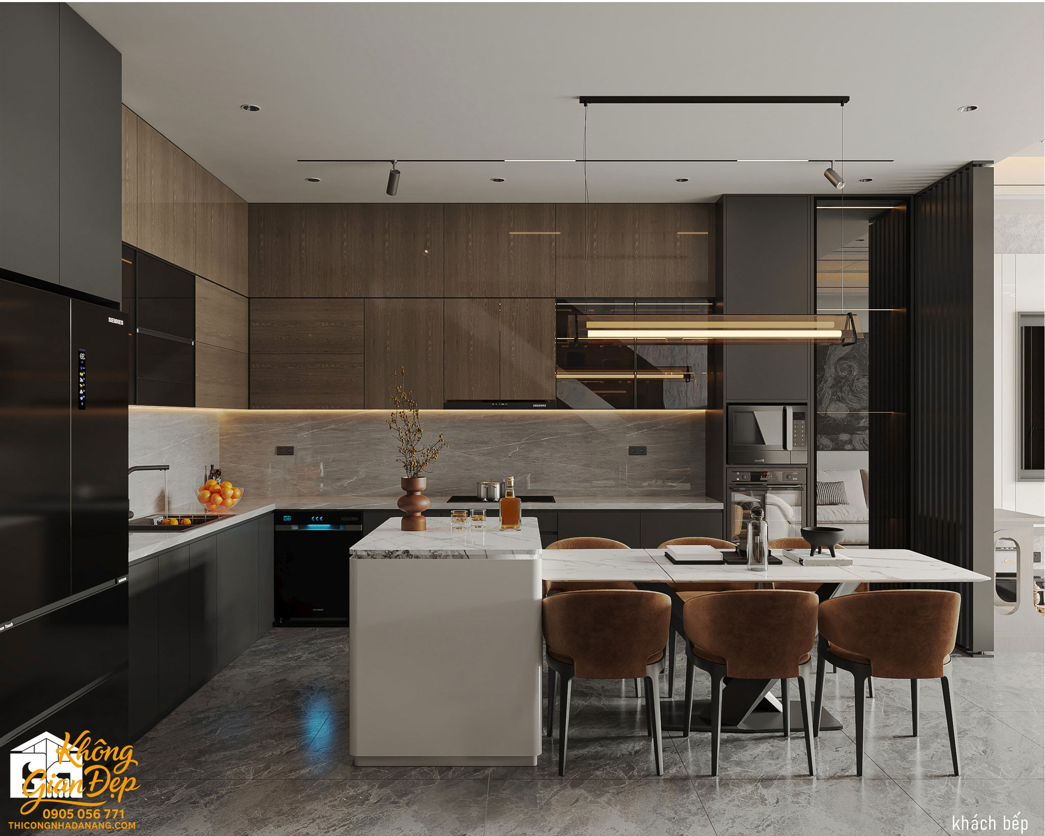 Khu vực bếp ăn được kết nối liền mạch. Bàn ăn lớn dành cho đại gia đình được bố trí thoáng đãng. Phòng giặt phơi cũng được thiết kế riêng biệt, đảm bảo tính thẩm mỹ và tiện dụng.