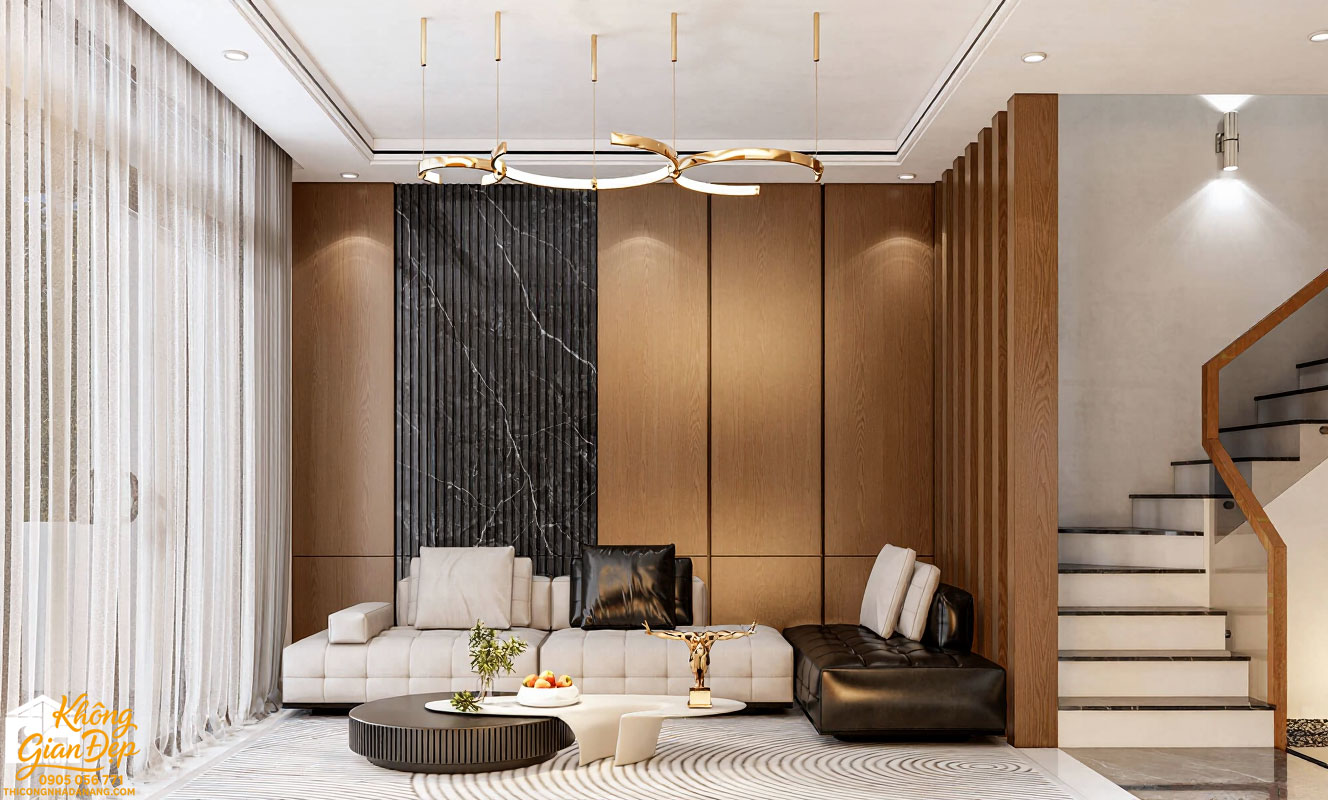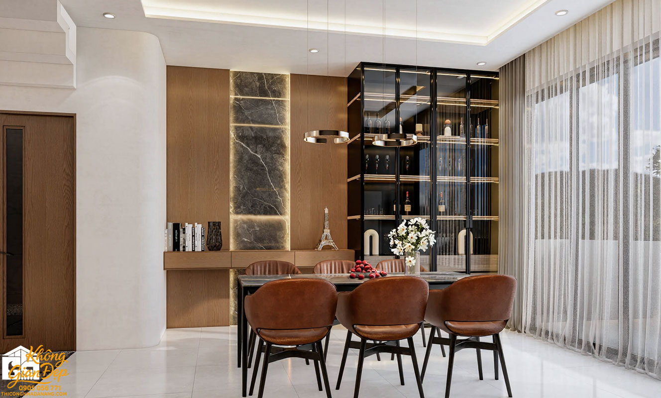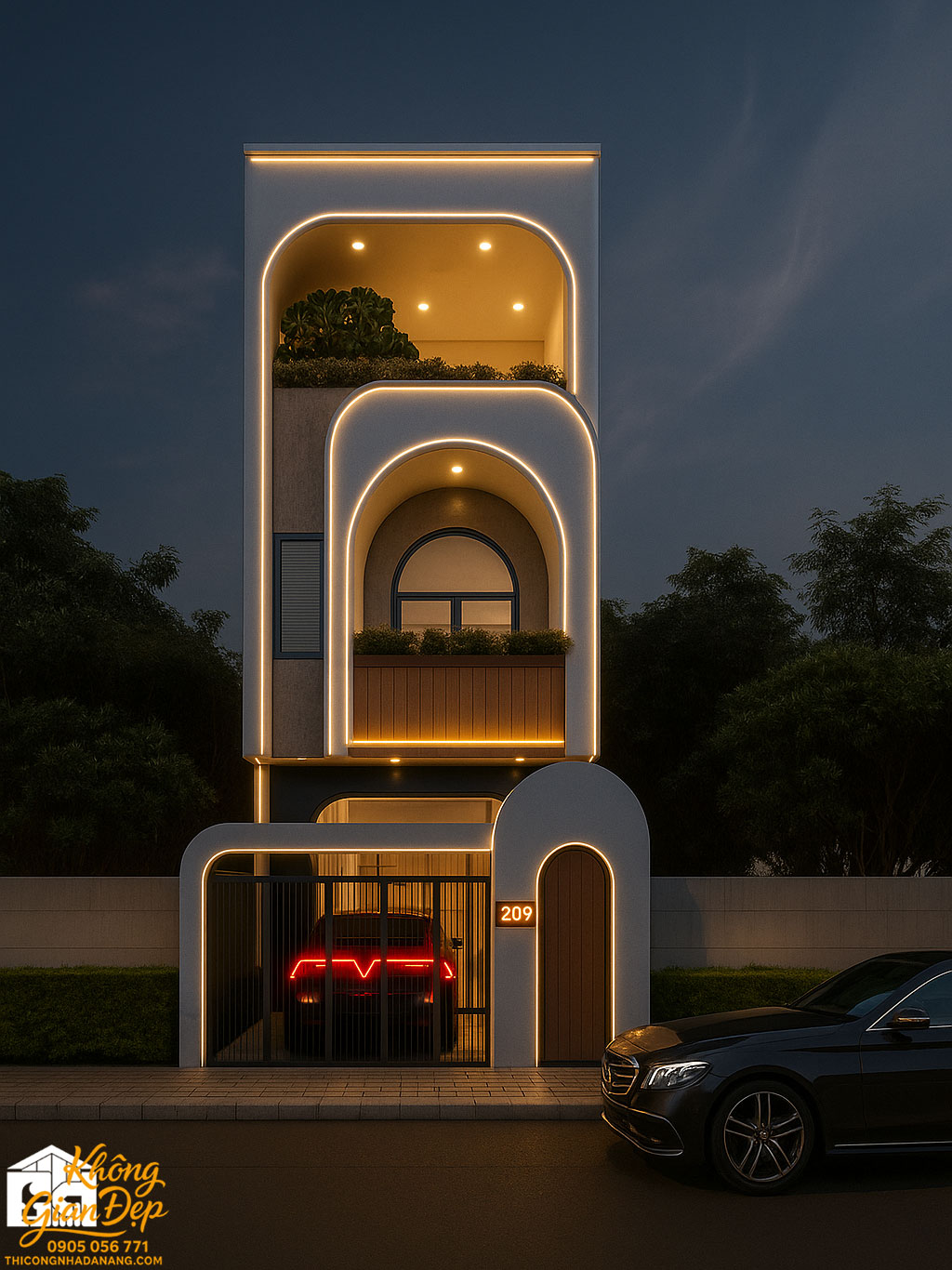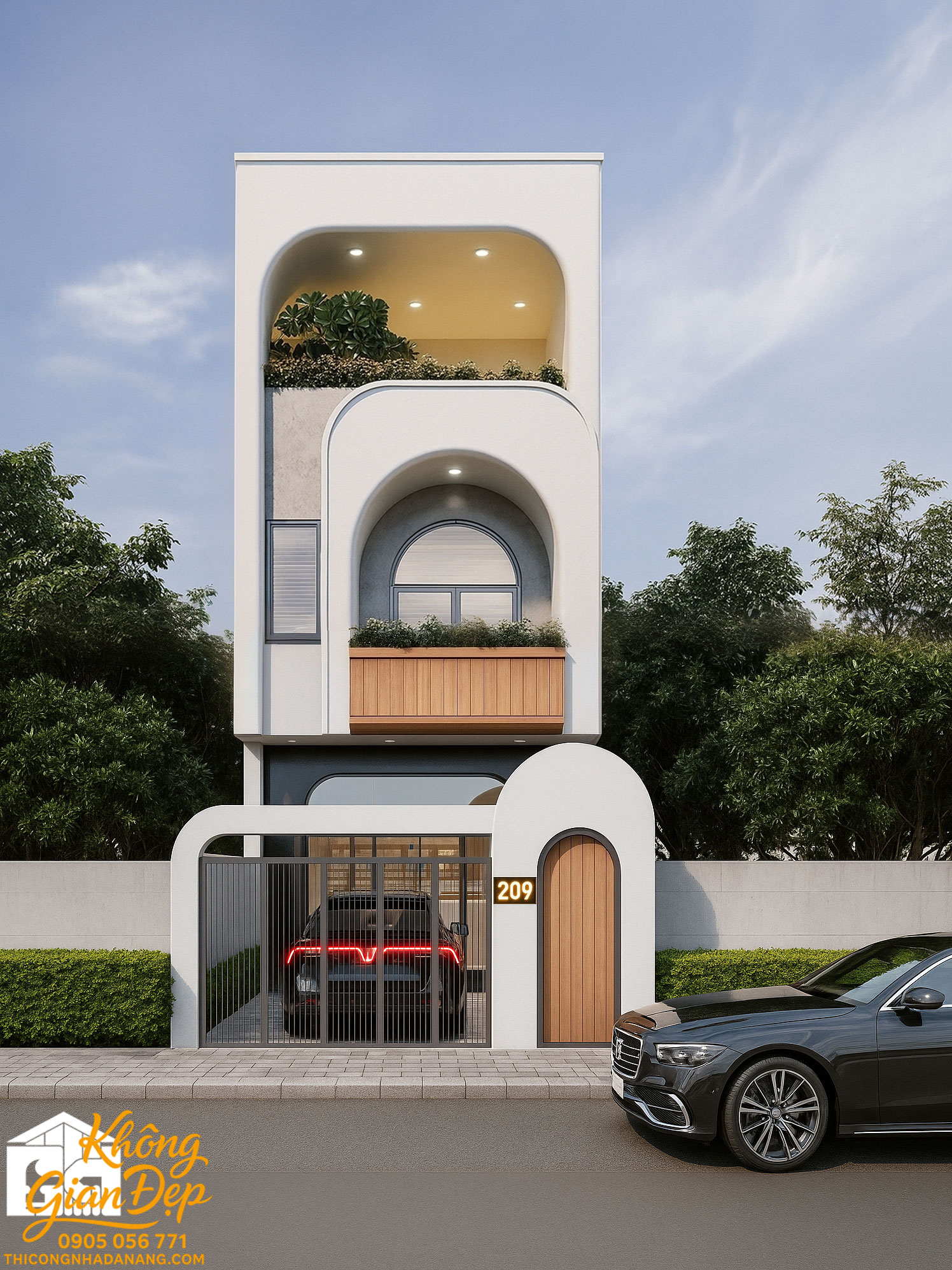 Mặt tiền ngôi nhà là một tuyên ngôn về phong cách sống hiện đại: không cầu kỳ, không phô trương, chỉ tập trung vào các mảng khối vuông vức và đường nét tinh gọn. Sự kết hợp giữa gam màu trung tính, vật liệu gỗ và ban công kính tạo nên một tổng thể hài hòa, sang trọng và không bao giờ lỗi mốt.