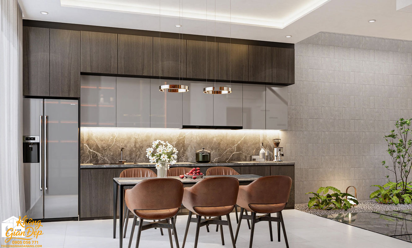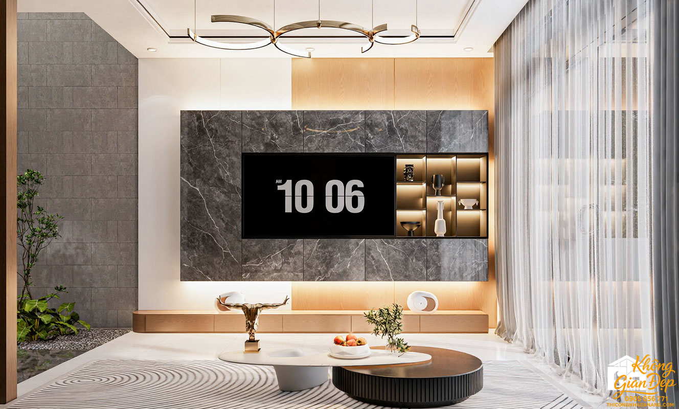 Phòng khách là trung tâm của ngôi nhà với bộ sofa lớn, vách tivi ốp gỗ ấm cúng. Không gian bếp được thiết kế gọn gàng với hệ tủ kịch trần và đảo bếp tiện lợi, là nơi cả gia đình quây quần bên những bữa ăn ngon.