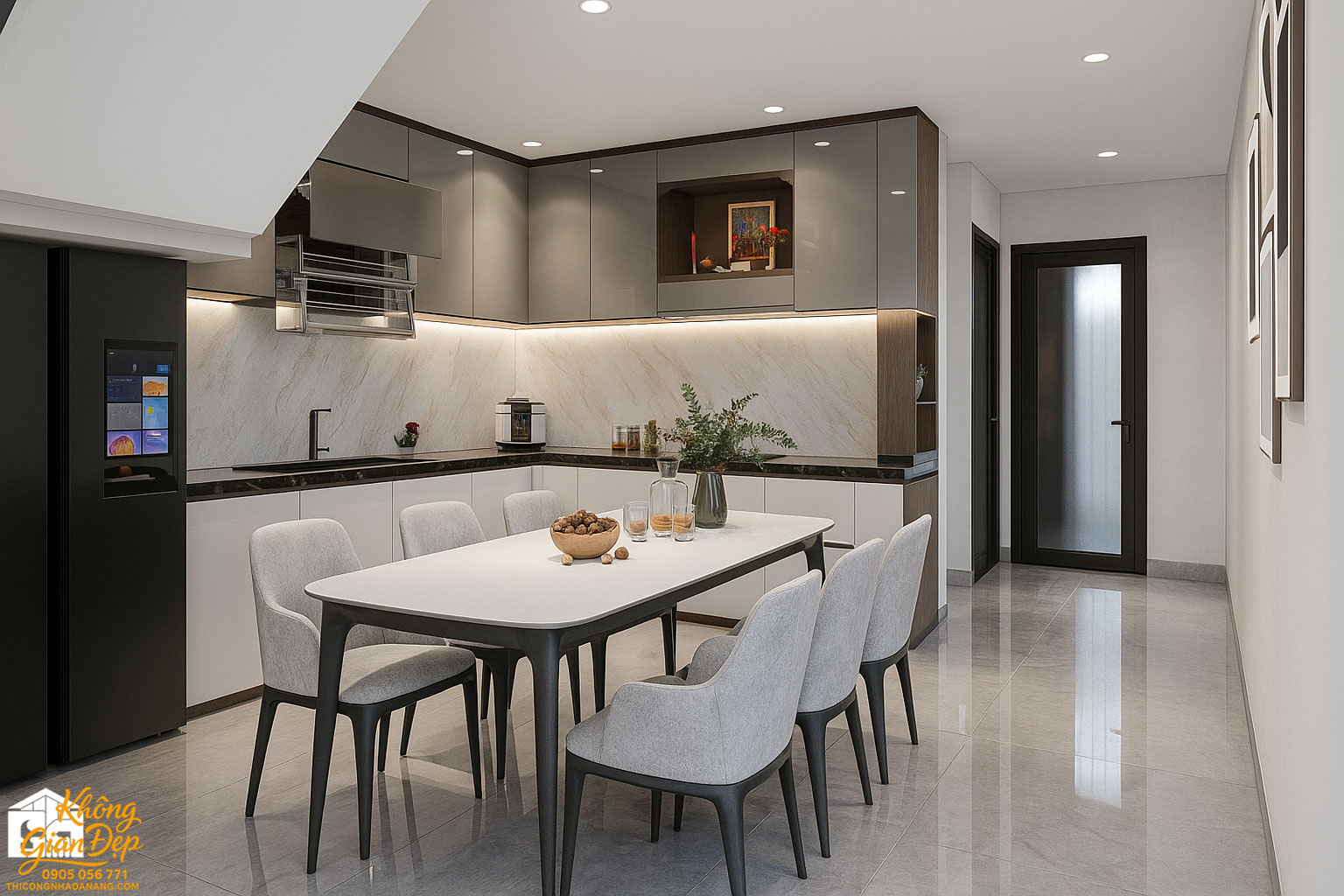 Khu vực bếp được trang bị hệ tủ bếp thông minh kịch trần, tối đa hóa không gian lưu trữ. Bàn ăn được đặt gọn gàng, là nơi cả gia đình quây quần bên những bữa cơm ấm cúng.