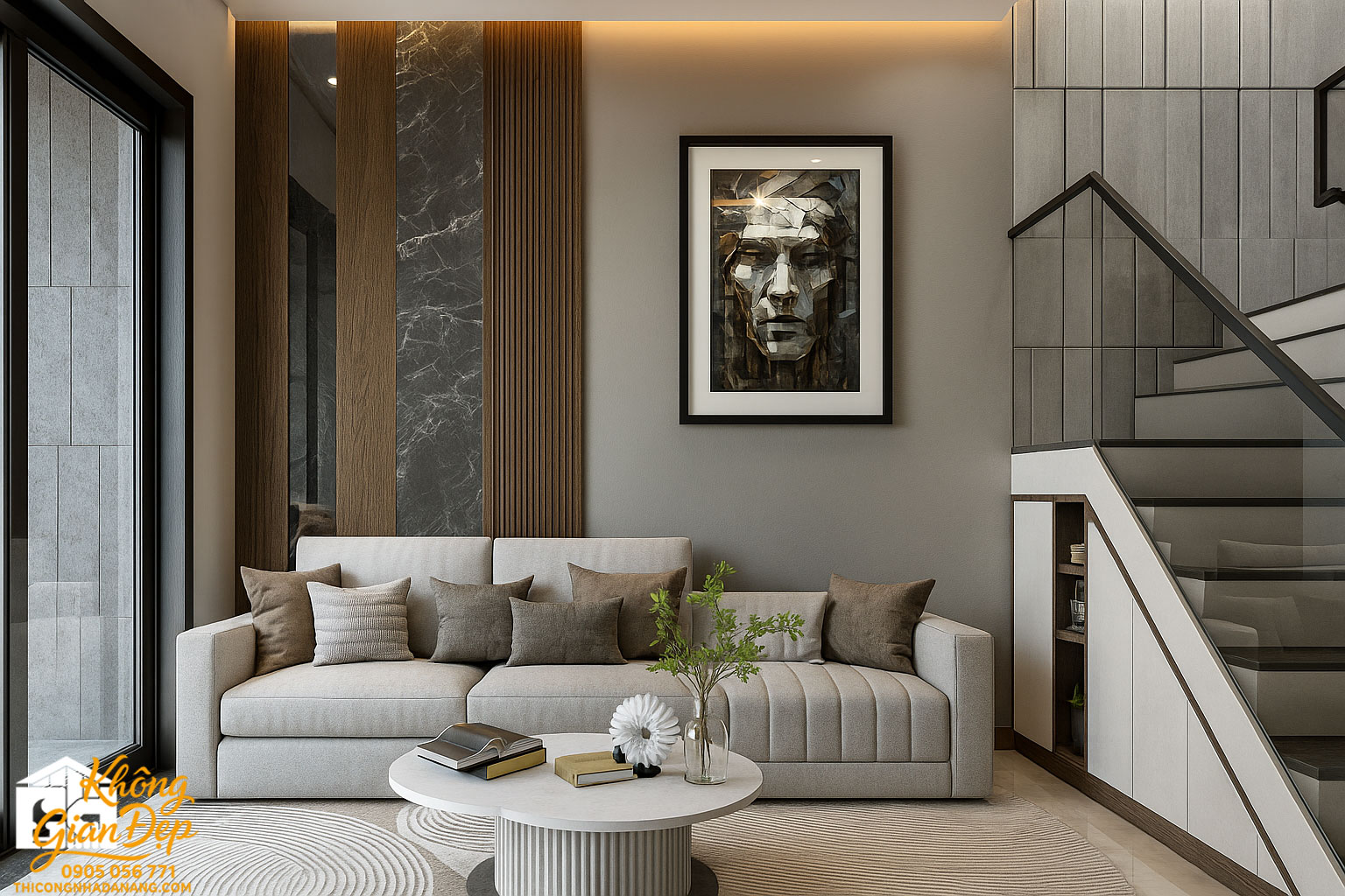 Phòng khách được xem là bộ mặt của ngôi nhà, nơi thể hiện gu thẩm mỹ của gia chủ. Với bộ sofa xám sang trọng, kệ tivi treo tường và vách ốp đá tinh tế, không gian tiếp khách trở nên vô cùng ấn tượng. Thiết kế mở liên thông với khu vực bếp và phòng ăn không chỉ giúp tối ưu diện tích mà còn tăng cường sự tương tác giữa các thành viên trong gia đình.