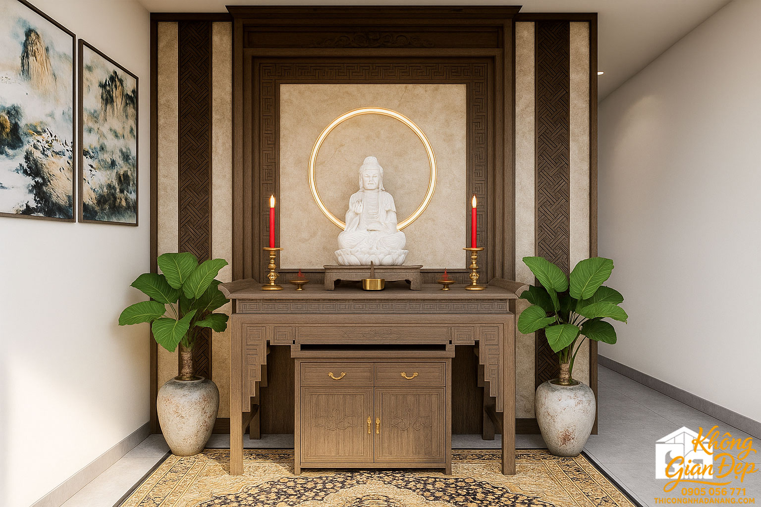 Phòng thờ được đặt ở vị trí trang trọng nhất trên tầng 3, hướng ra sân thượng phía trước, đảm bảo sự yên tĩnh và thông thoáng. Không gian được thiết kế với vật liệu gỗ chủ đạo, tạo nên vẻ ấm cúng và tôn nghiêm.