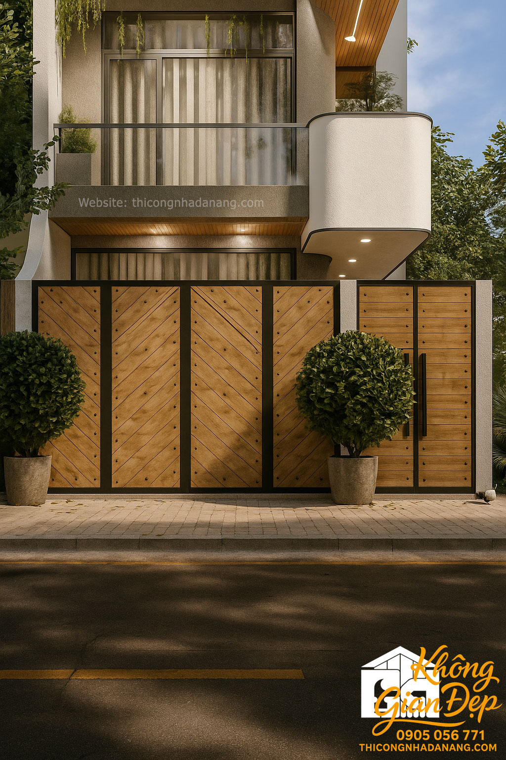Chú thích: Sự kết hợp vật liệu khéo léo từ cổng gỗ xương cá đến ban công bo tròn thể hiện sự tỉ mỉ trong thiết kế.