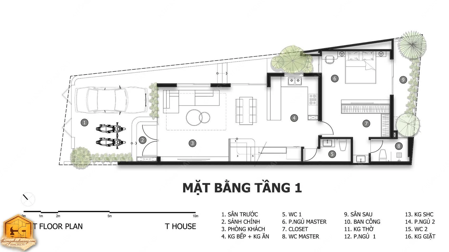 - Giếng Trời Trung Tâm: Đảm bảo luồng không khí nóng được rút lên và thoát ra khỏi mái, đồng thời hút không khí mát từ tầng trệt vào. Đây là “lá phổi” điều hòa chính của ngôi nhà.