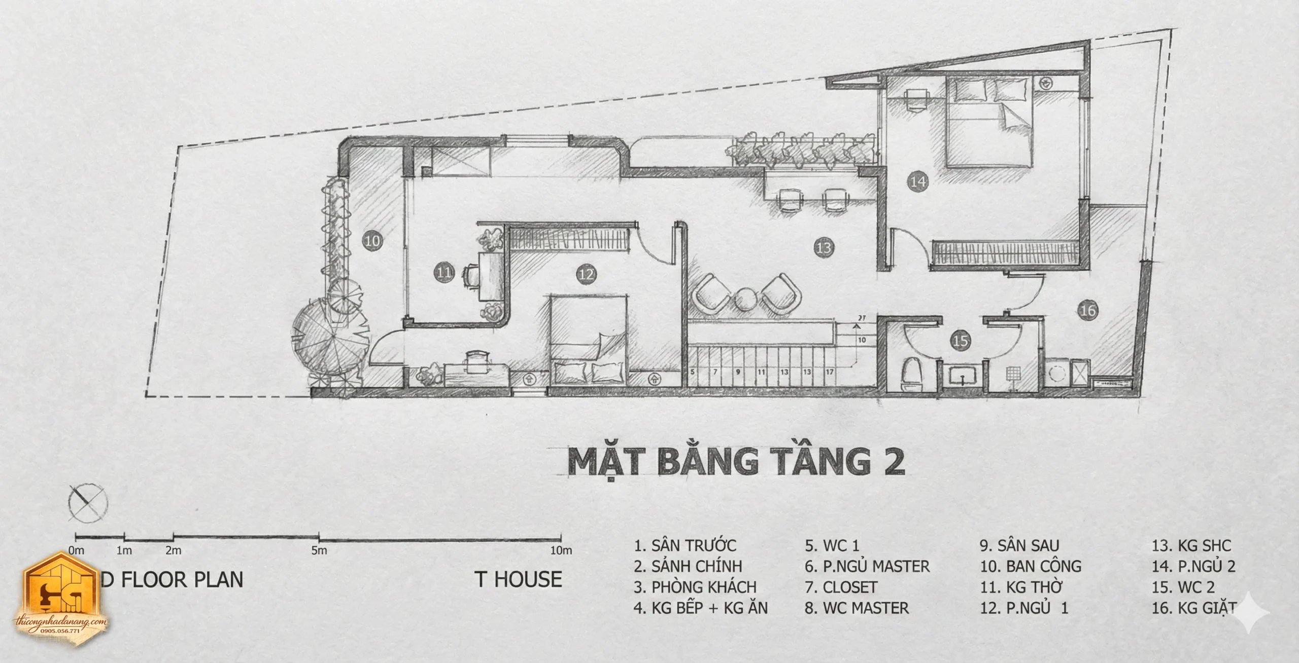 - Vật liệu Chống Nóng Mái: Mái được xử lý bằng hệ thống chống nóng (gạch block, lớp cách nhiệt PU/XPS) kết hợp với mái dốc hoặc mái bằng có lớp vật liệu phản xạ nhiệt, giảm thiểu tối đa nhiệt lượng truyền xuống tầng 2.