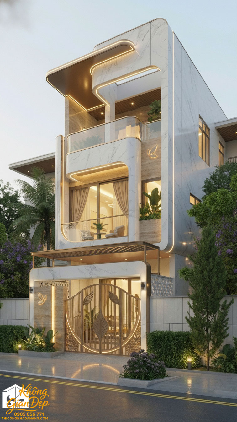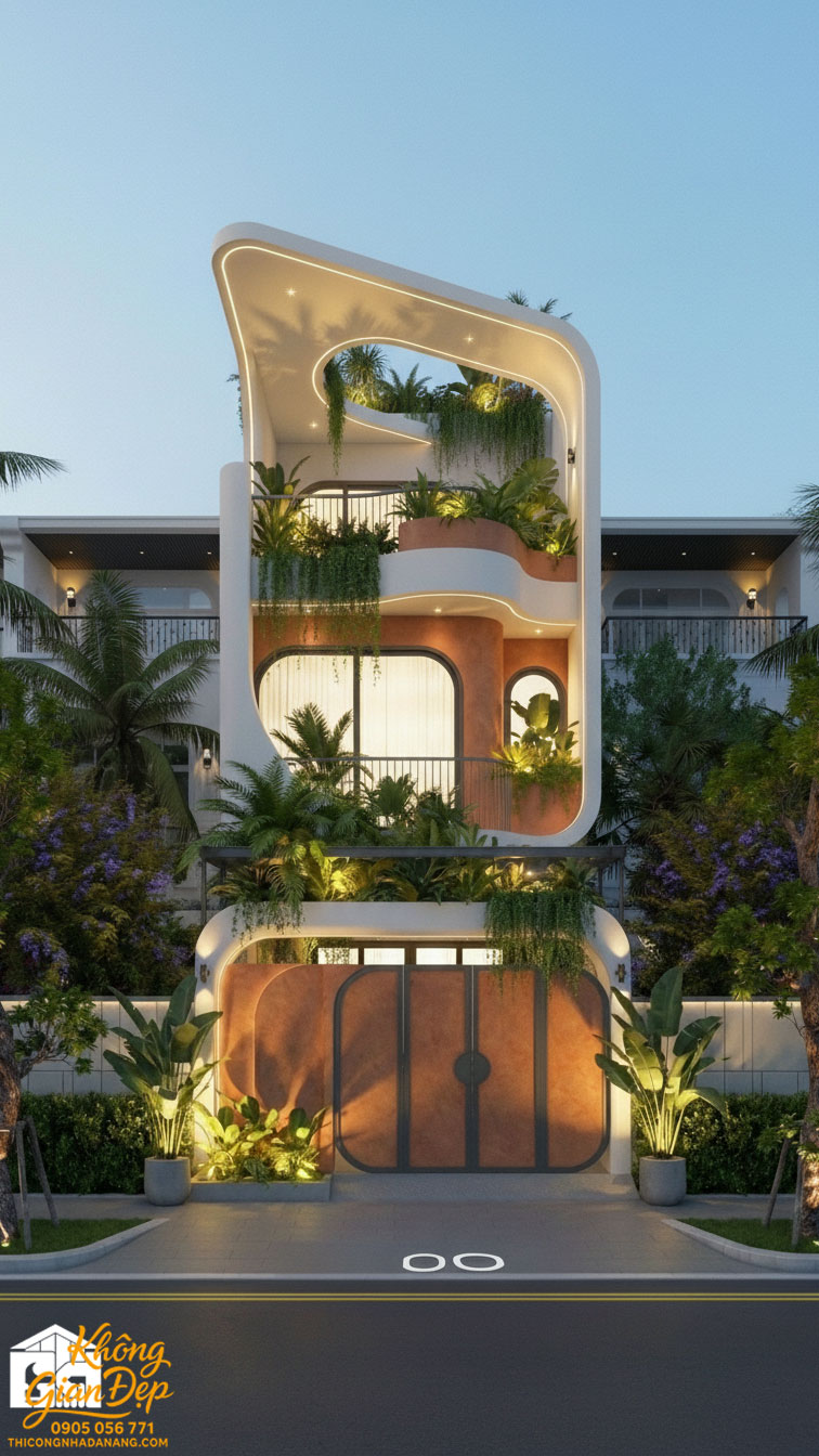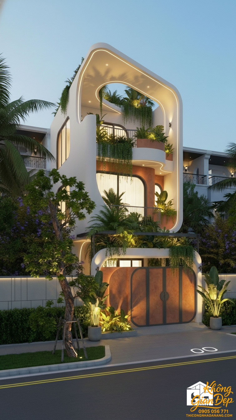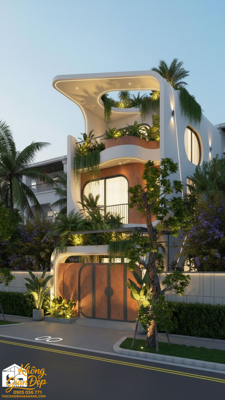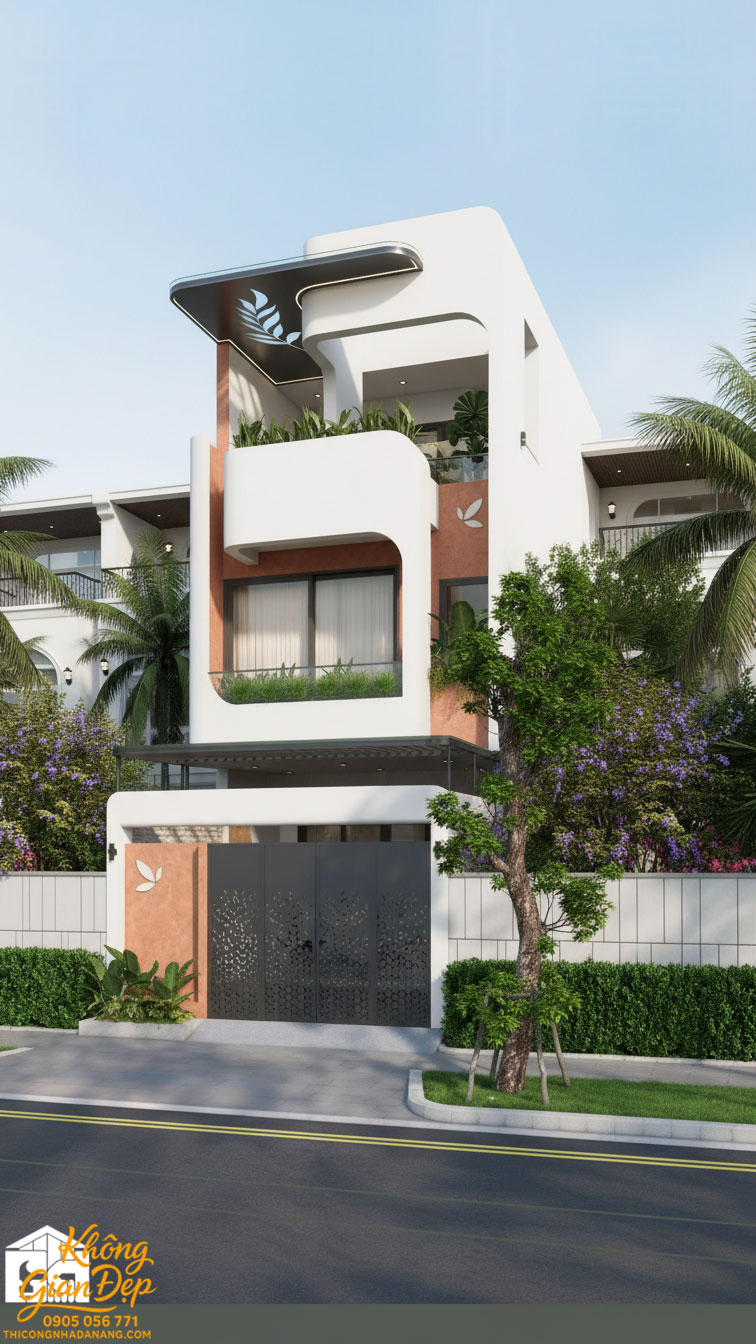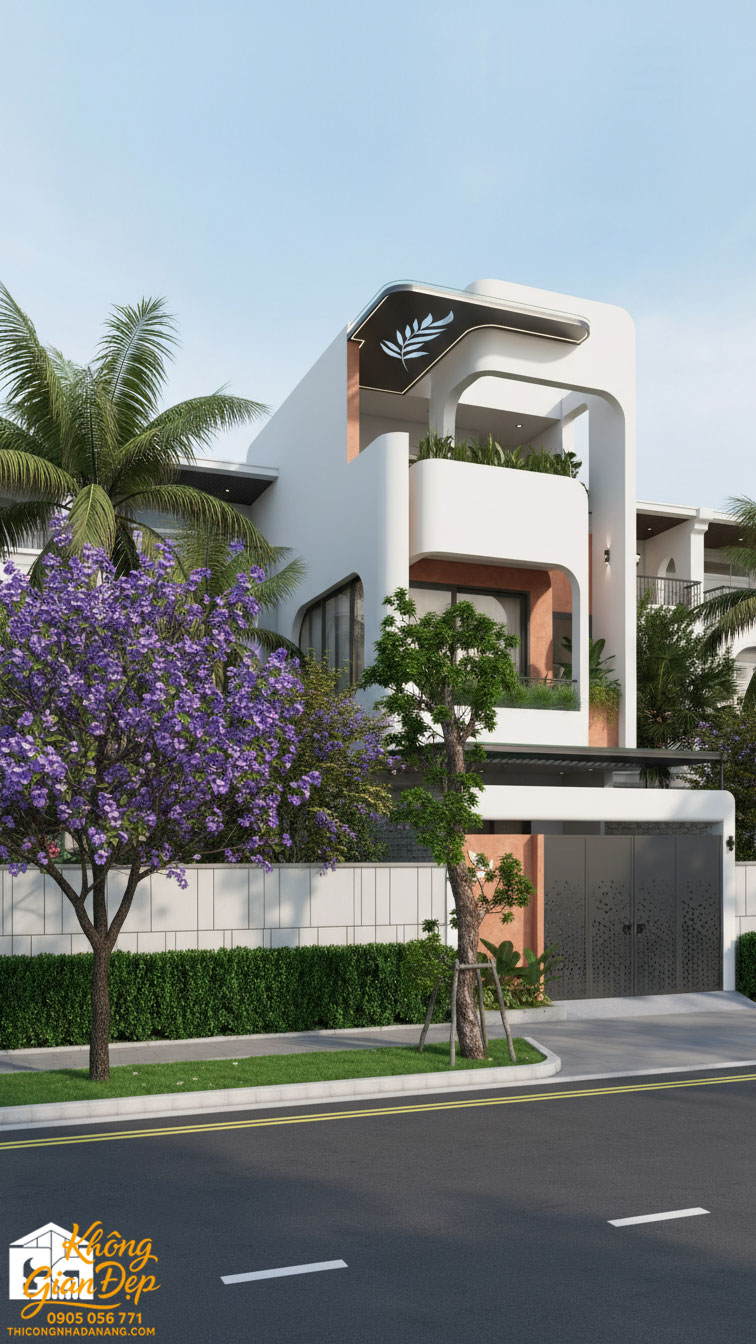 Đây là phương án dành cho những gia chủ yêu thích sự phá cách và nghệ thuật. Thay vì những khối bê tông vuông vức truyền thống, chúng tôi sử dụng ngôn ngữ thiết kế “Soft Architecture” (Kiến trúc mềm). Các đường cong uốn lượn ở ban công không chỉ tạo điểm nhấn thị giác cực mạnh mà còn giúp “làm mềm” sự thô cứng của vật liệu.
