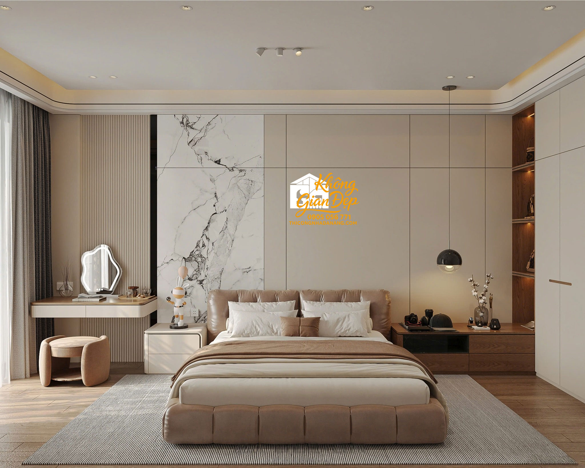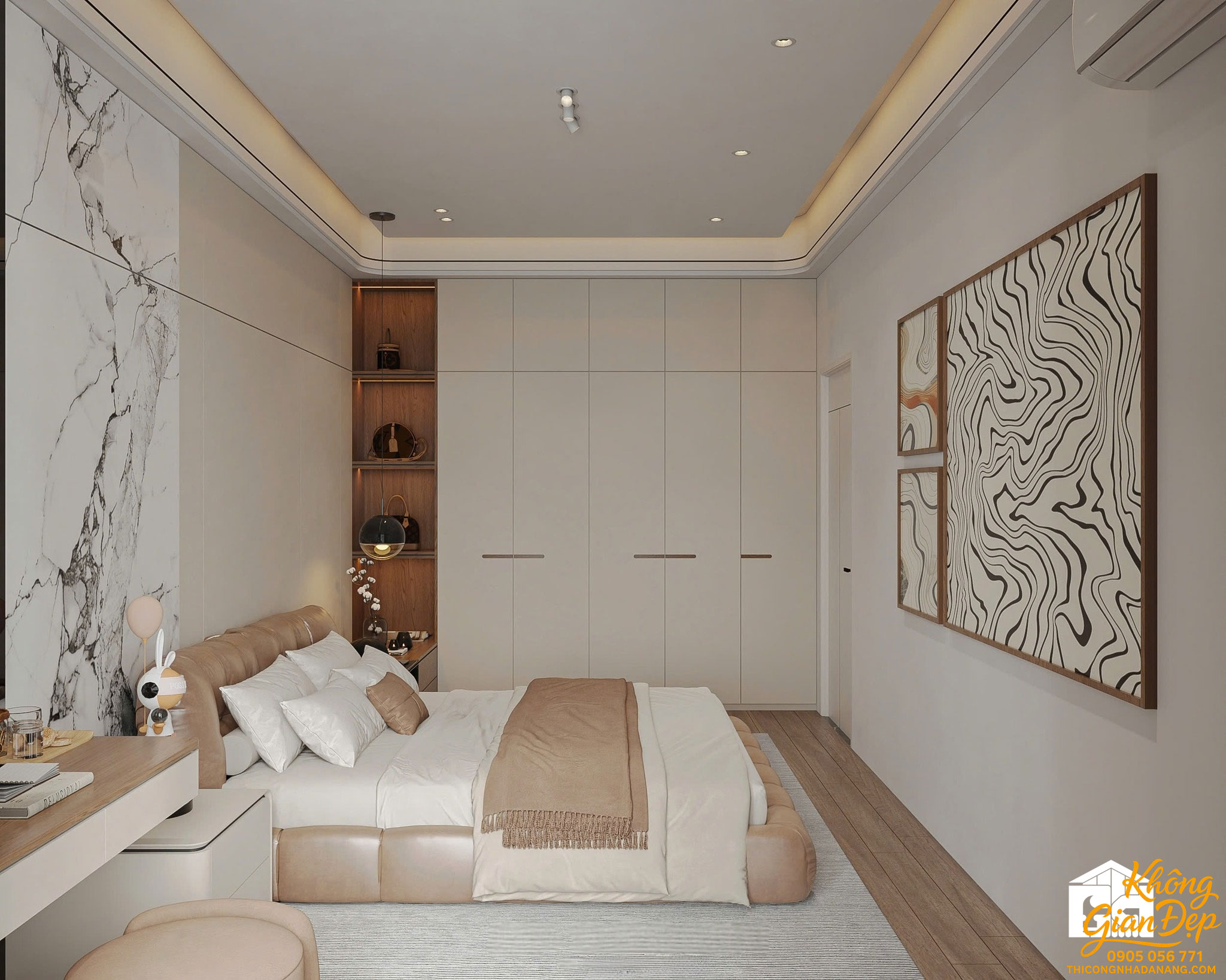 • Phòng Ngủ Master: Thiết kế chuẩn khách sạn với tông màu trầm, sàn gỗ xương cá và hệ tủ áo cánh kính thời thượng. Góc làm việc được tích hợp khéo léo, đảm bảo sự yên tĩnh.