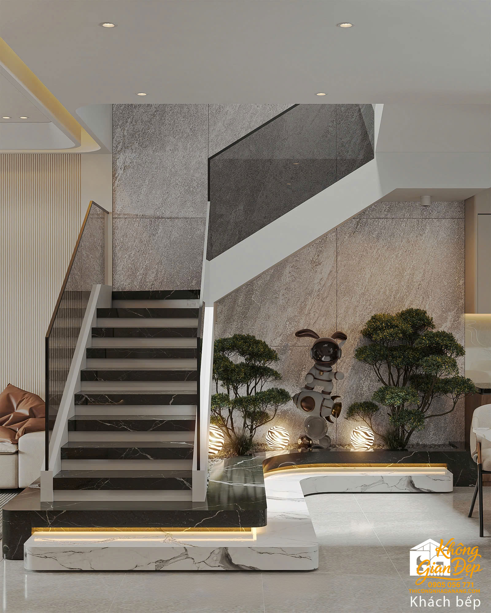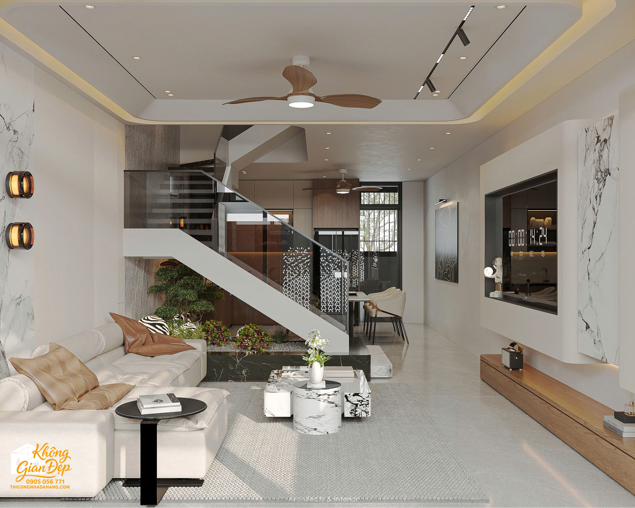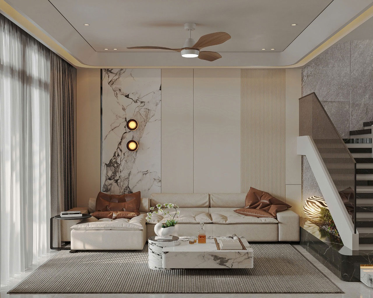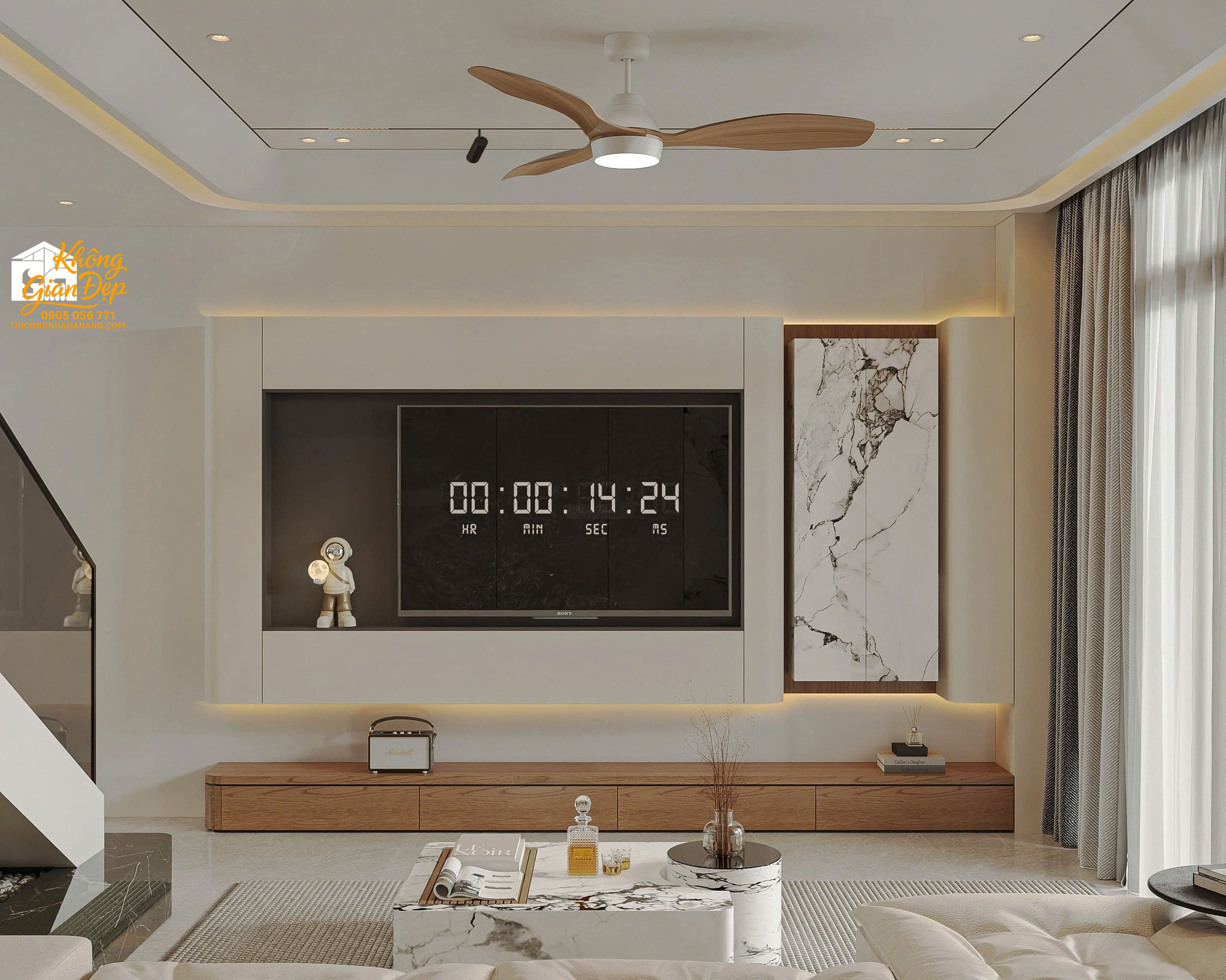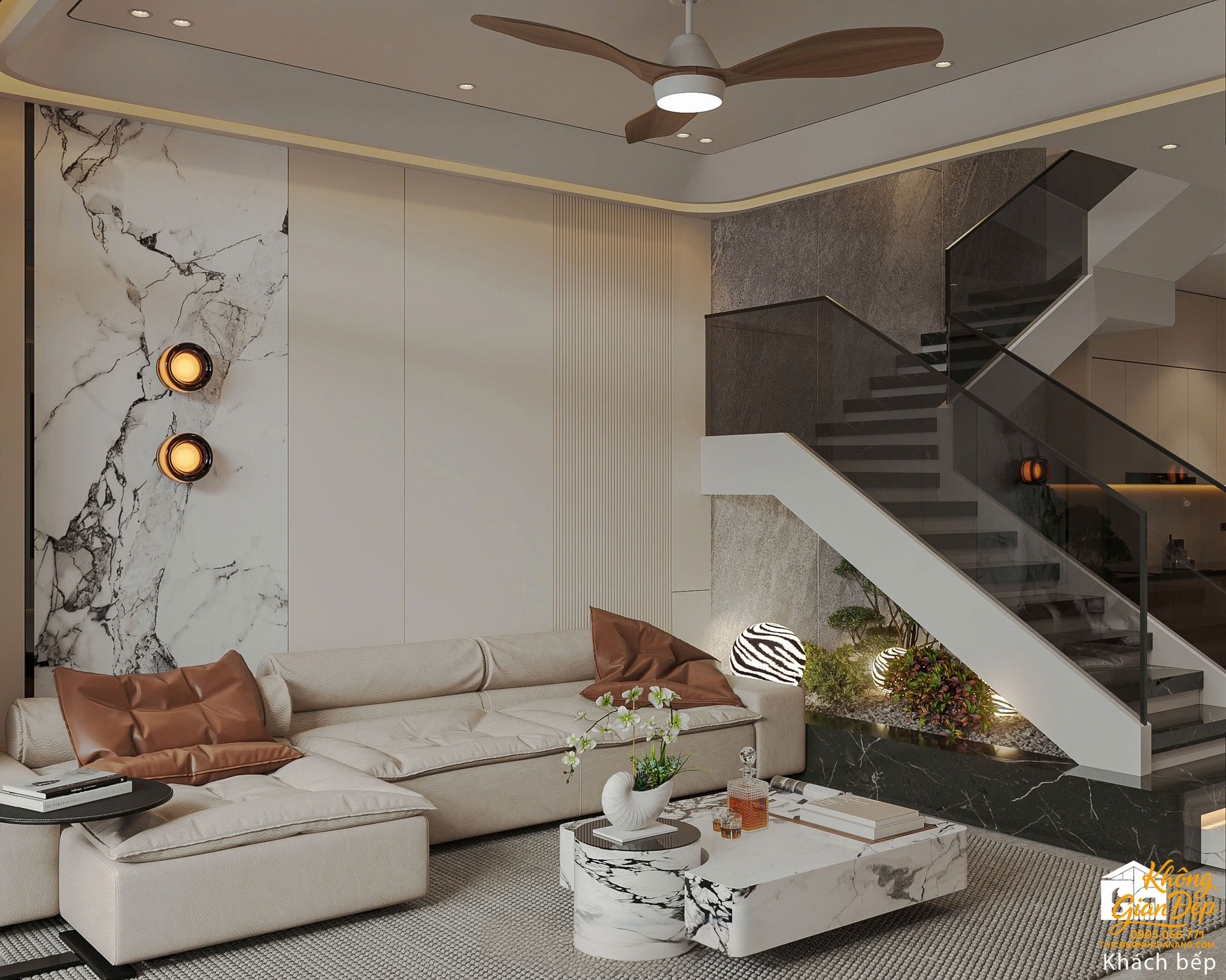 Phòng khách sử dụng tông màu trung tính (Be, Xám, Nâu gỗ) làm chủ đạo. Việc kết hợp tư vấn phong thuỷ vào bố trí nội thất giúp dòng khí lưu thông từ cửa chính vào nhà không bị cản trở, mang lại vượng khí cho gia chủ. Vách tivi ốp đá vân mây khổ lớn chính là điểm nhấn “luxury” cho căn phòng.