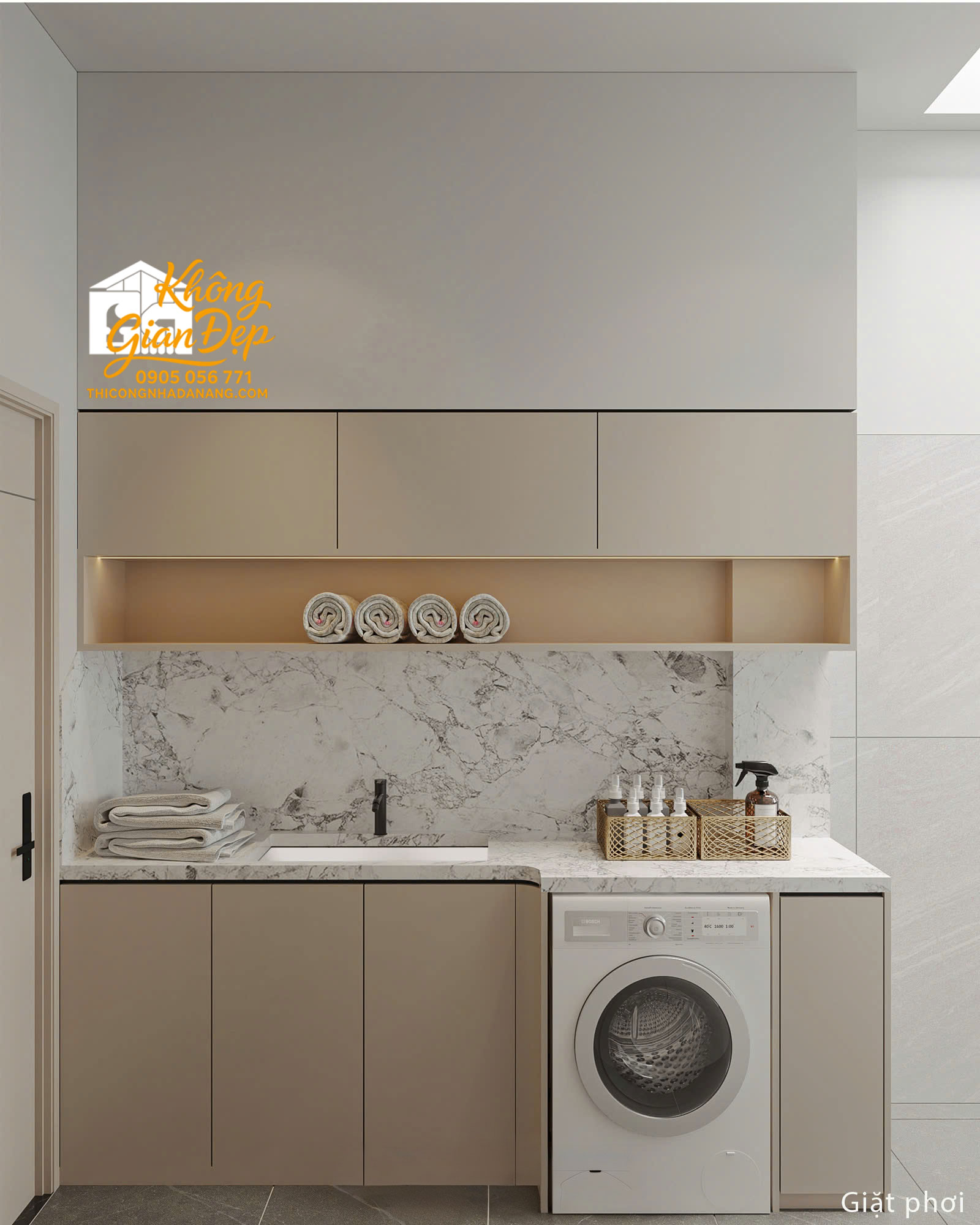 Với diện tích nhà phố, việc tích hợp công năng là vô cùng quan trọng. Chúng tôi đã khéo léo bố trí khu vực giặt sấy ẩn mình tinh tế ngay gần khu vực bếp/sân sau, giúp việc nội trợ trở nên thuận tiện hơn bao giờ hết.