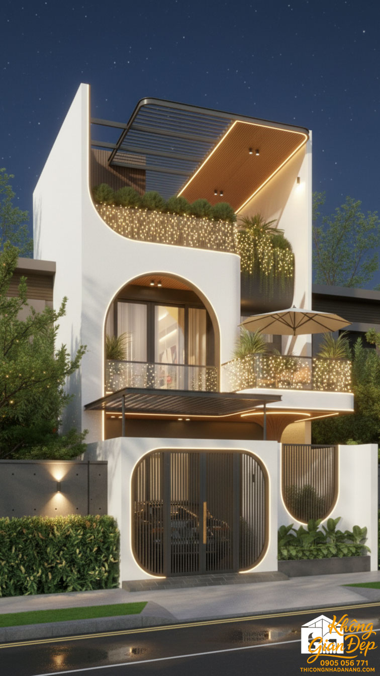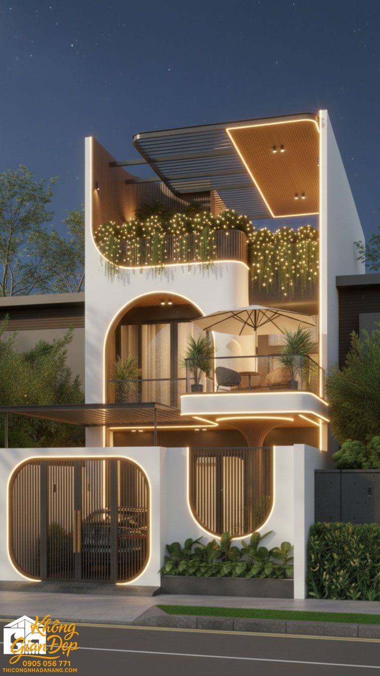Khi màn đêm buông xuống, ngôi nhà thực sự “lột xác”. Hệ thống chiếu sáng nghệ thuật (Architectural Lighting) được các kiến trúc sư tính toán tỉ mỉ, biến ngôi nhà thành một viên ngọc sáng nổi bật giữa khu phố.