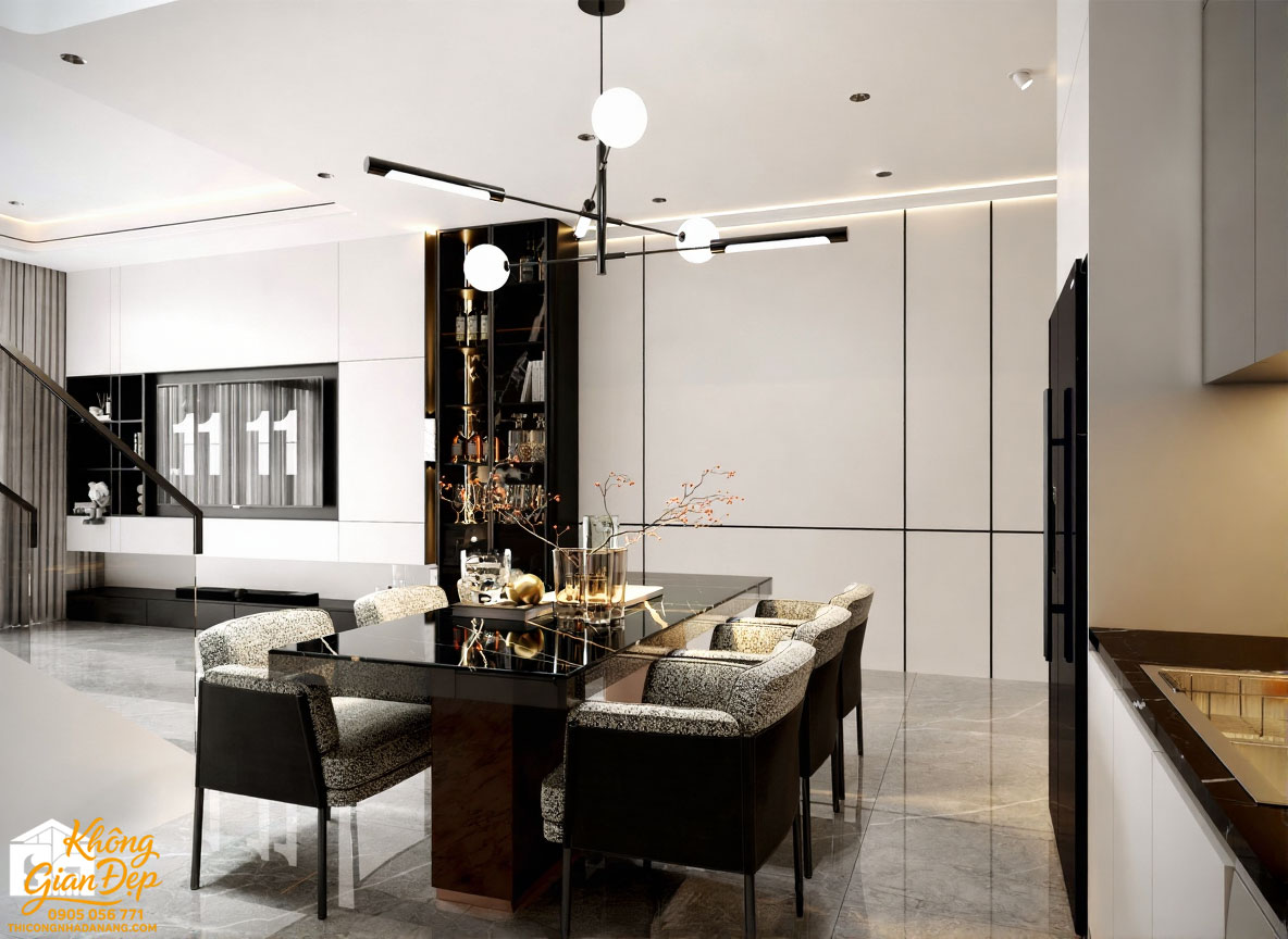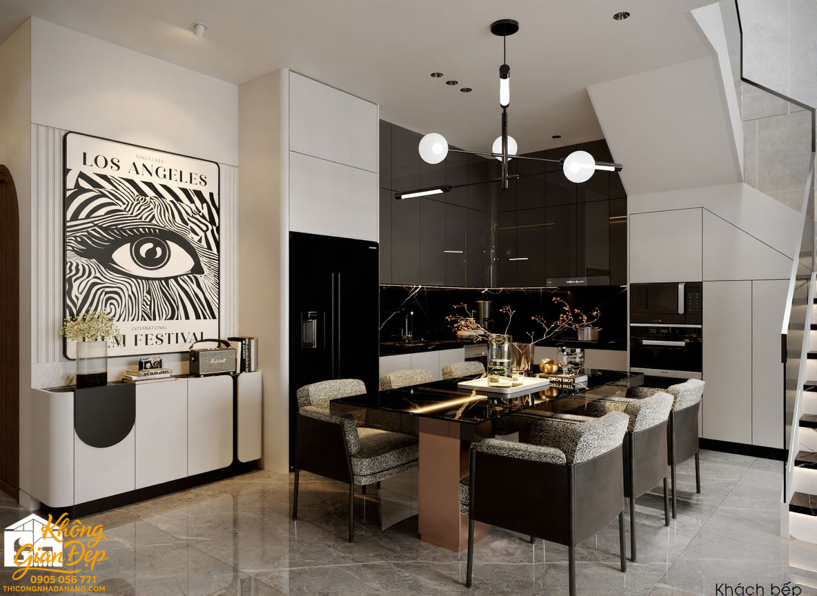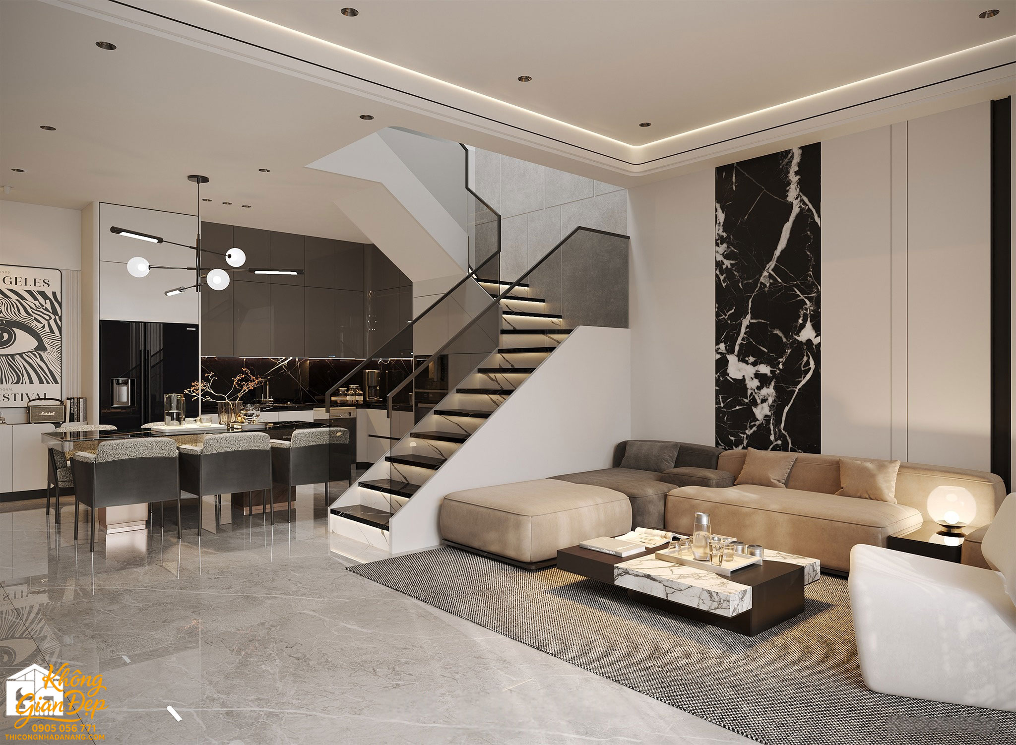Tạm biệt những bức tường ngăn cách bí bách, tầng 1 là một không gian mở liên hoàn giữa phòng khách và bếp ăn. Sàn nhà được lát gạch khổ lớn vân đá Marble, kết hợp cùng nội thất tone màu trầm tạo nên sự sang trọng chuẩn mực.