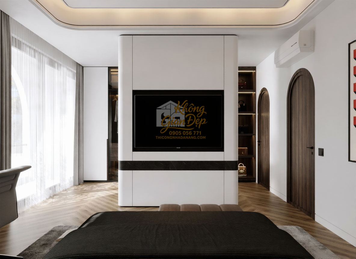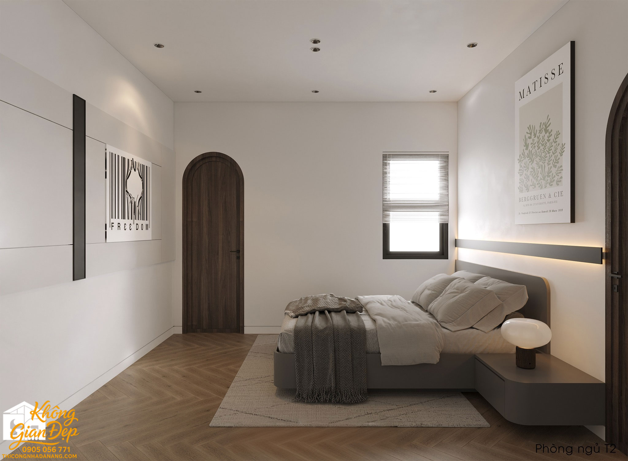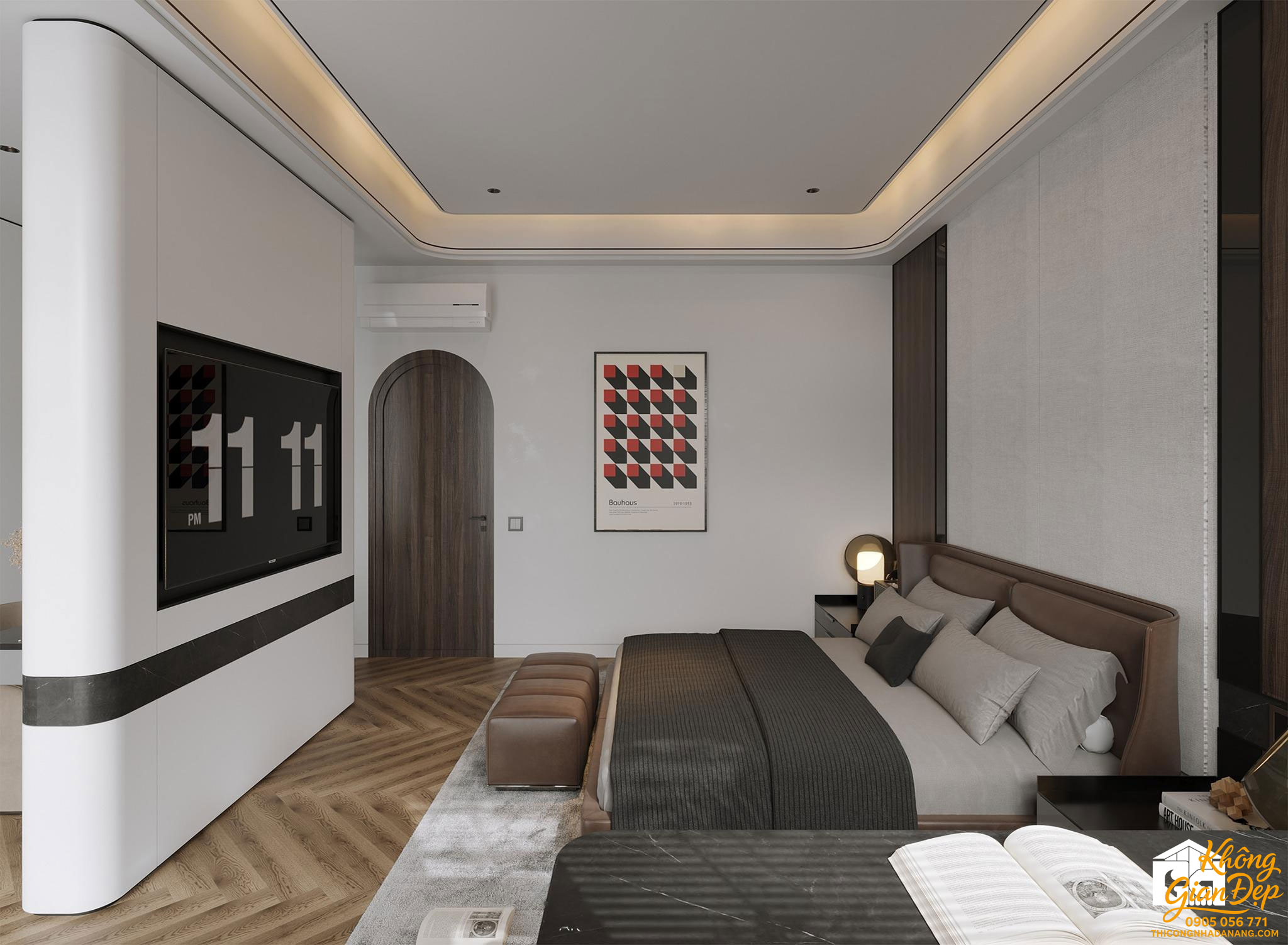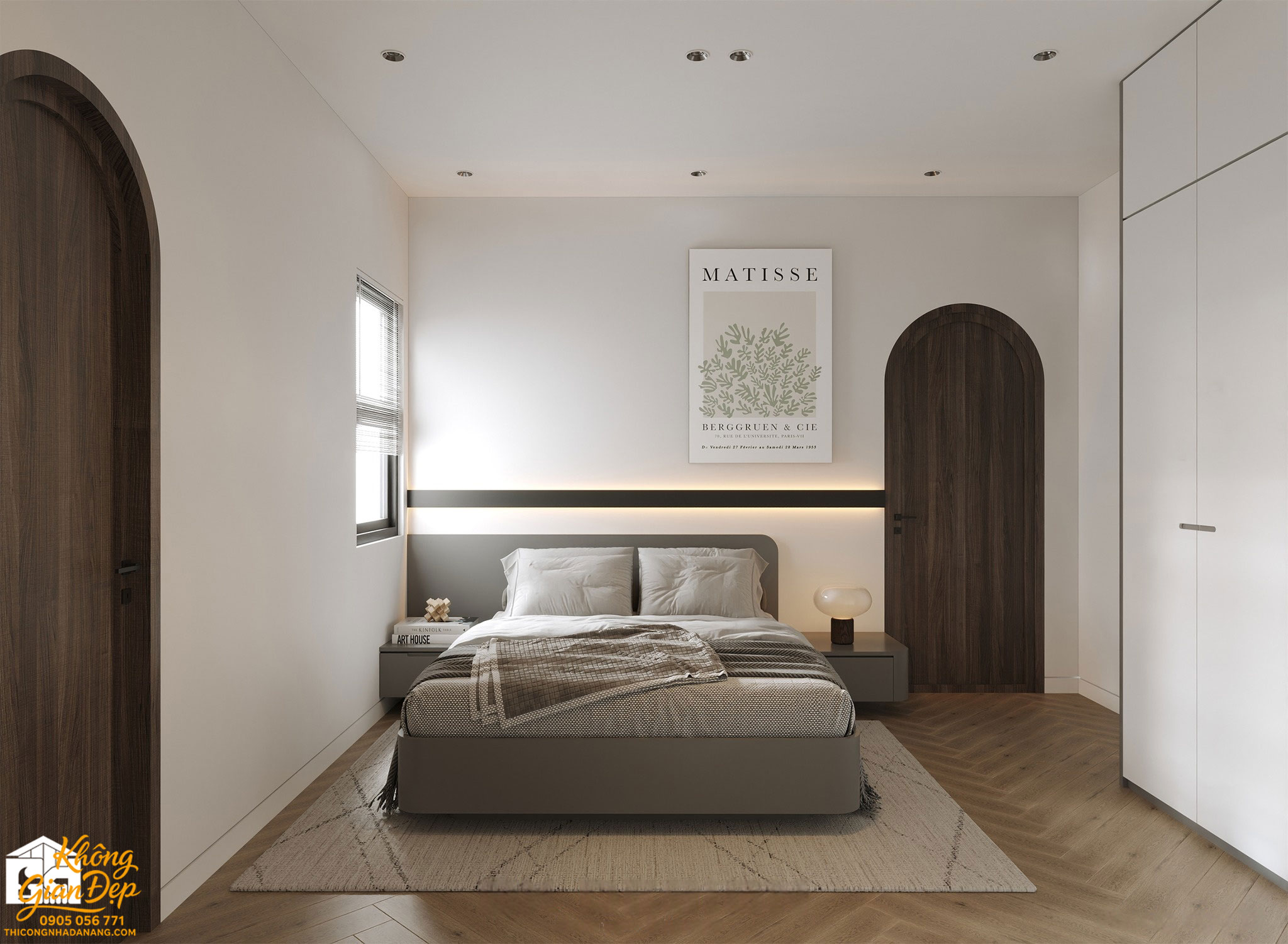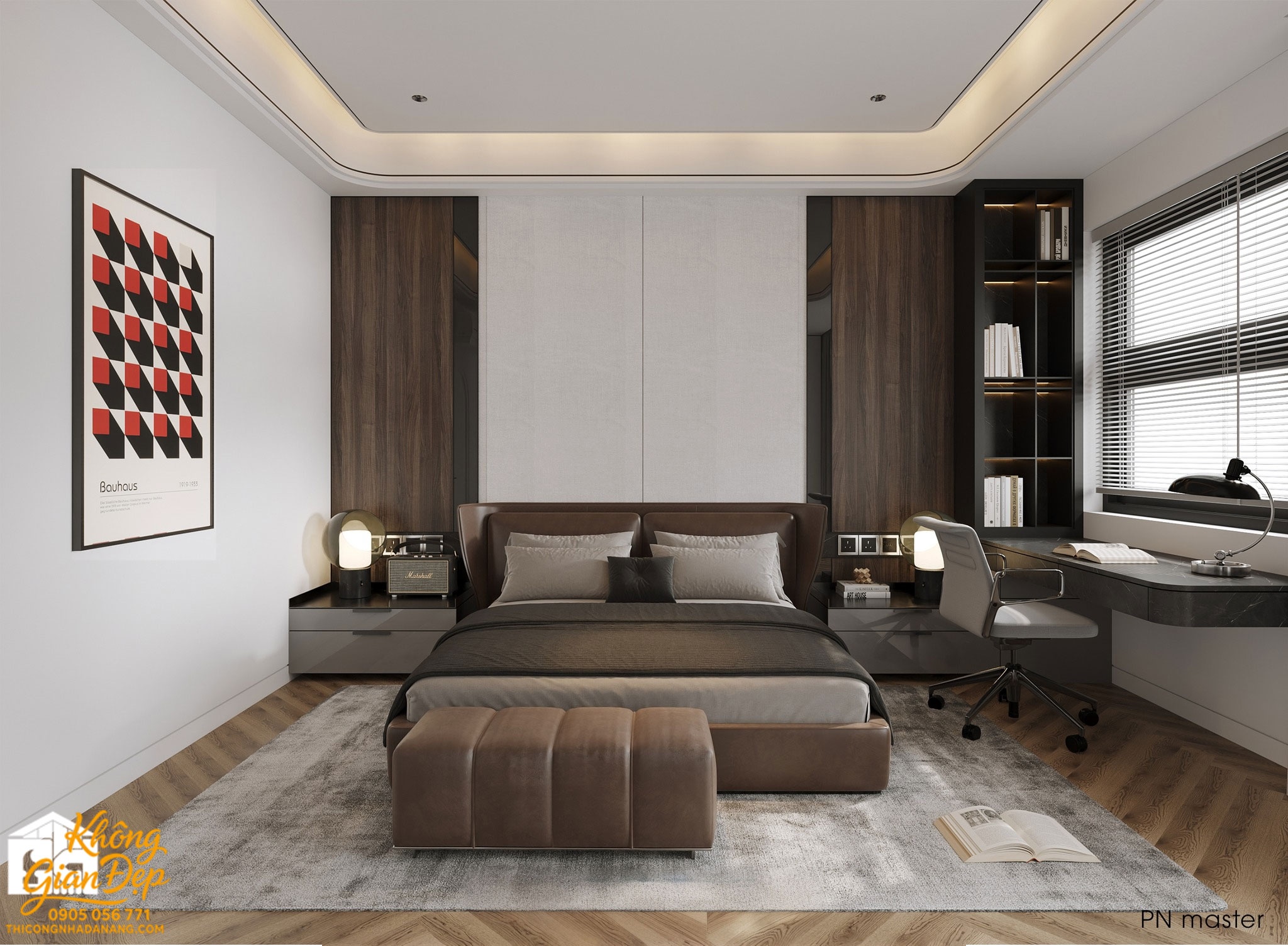 Phòng ngủ Master chiếm trọn diện tích mặt sàn tầng 2, được thiết kế như một căn Penthouse thu nhỏ. Đây là nơi tư vấn phong thuỷ và thẩm mỹ giao thoa, mang lại giấc ngủ vượng khí.