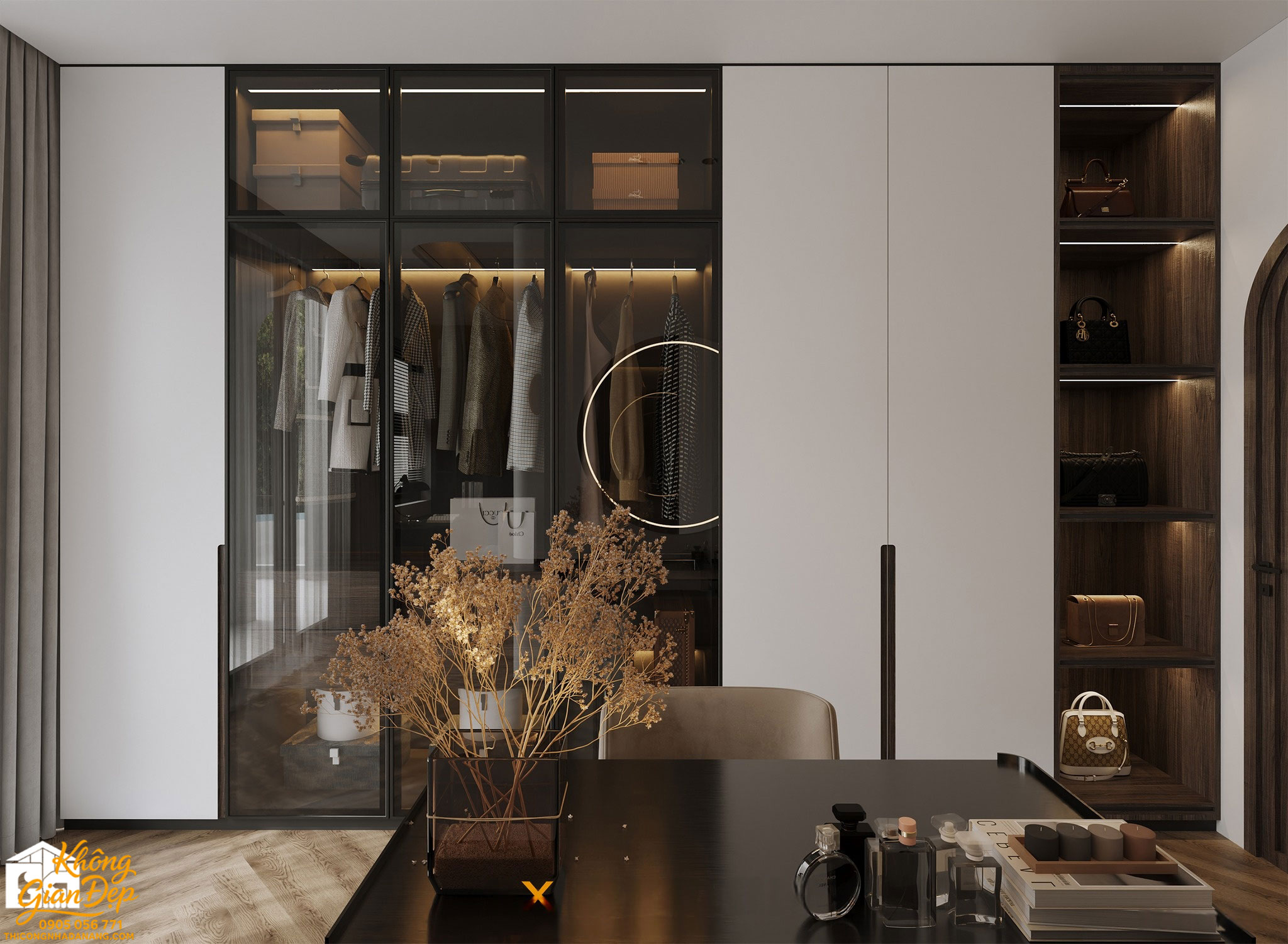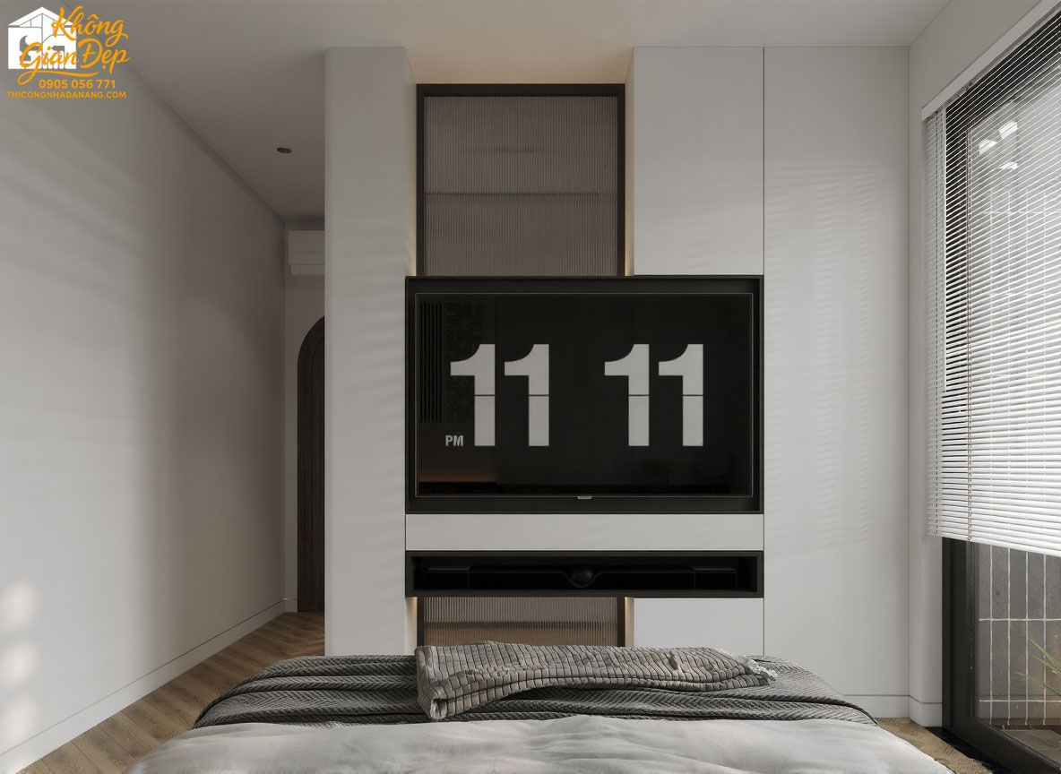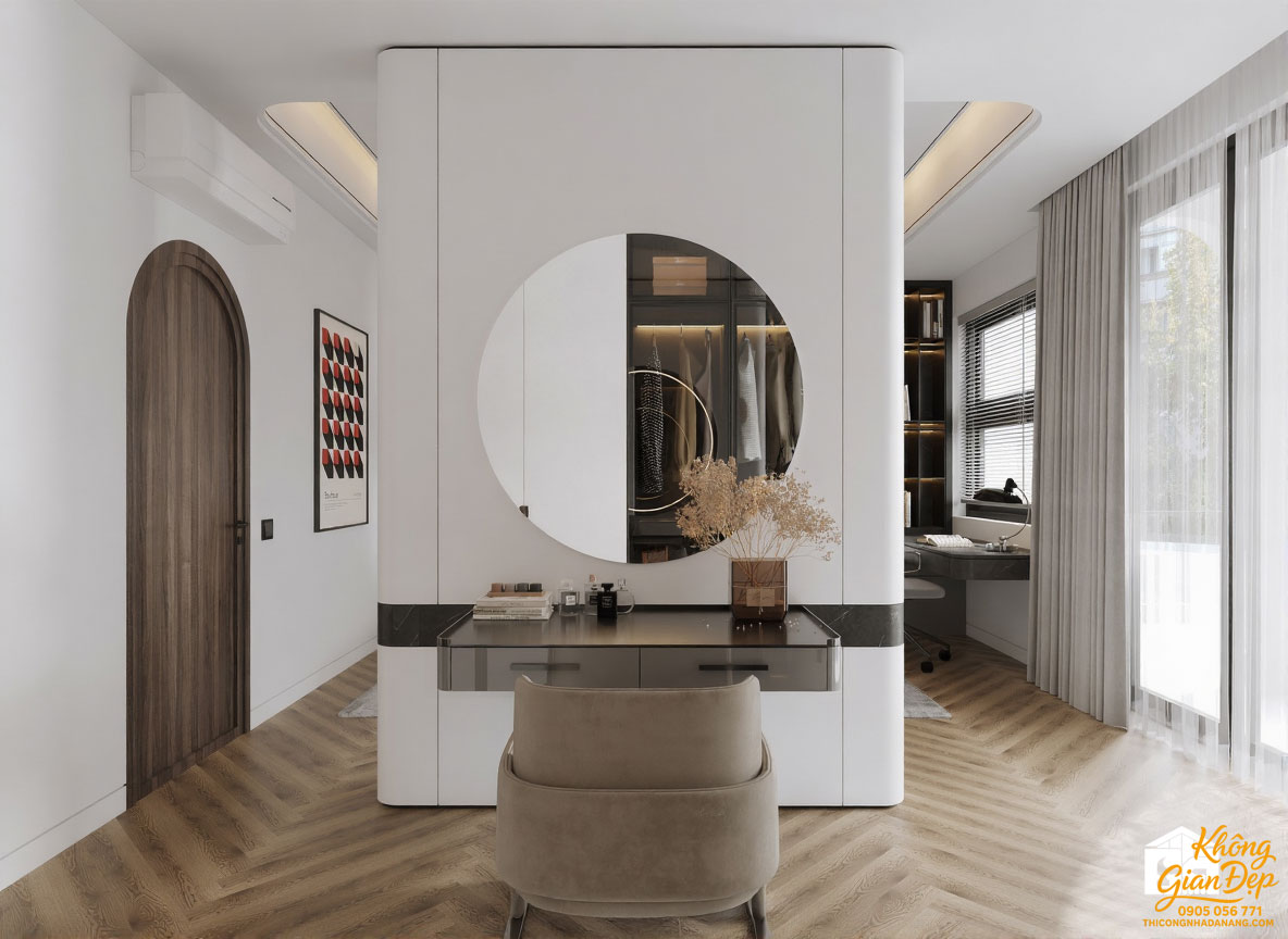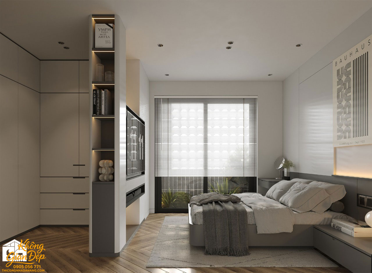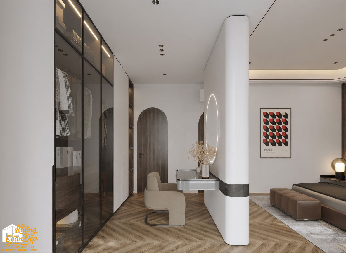 Phòng ngủ Master chiếm trọn diện tích mặt sàn tầng 2, được thiết kế như một căn Penthouse thu nhỏ. Đây là nơi tư vấn phong thuỷ và thẩm mỹ giao thoa, mang lại giấc ngủ vượng khí.